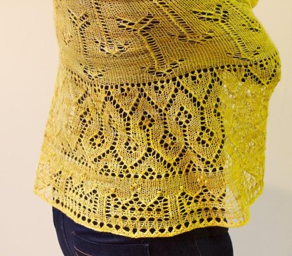 This semi-circular shawl is inspired by Lucy Pevensie in The Chronicles of Narnia by C.S. Lewis. The lace patterns include brocade-like bands that might have appeared on Lucy's dresses when she was a queen, arrows because she was an excellent archer, and crowns, both because she was a queen and because she loved to play chess.