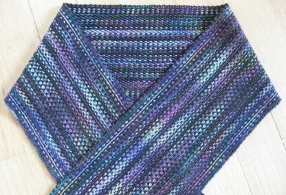 Knit in the round. All knit and slip stitches, no purling. No ends to work in. Creates a rectangular scarf or shawl, with fringe.