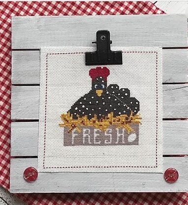 I am pleased to introduce to you my favorite chicken, Aunt Bea! She sits patiently in her box of straw laying her eggs with an occasional squawk so you know she is doing her job! She is stitched with whole stitches, half stitches, a little back stitching and some French knots just to give her character!