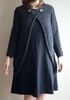 A very quick to knit sweater-wrap, and lovely to wear over clothing you don’t necessarily want to hide, the Luna Wrap keeps the arms warm, but let’s your favorite dress shine through. Though this is knit with a cotton, you could use any Aran-weight fibre to make this wrap.