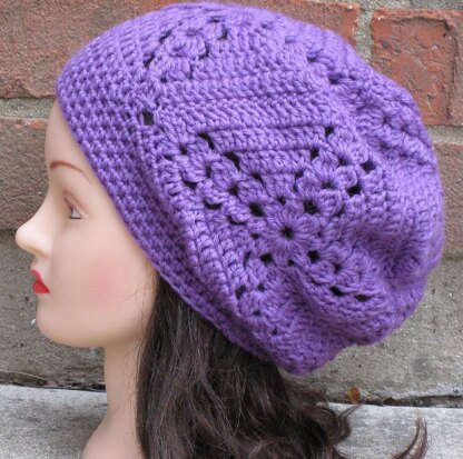 This is a pretty, unique slouchy hat constructed almost entirely out of granny squares! This hat is both feminine and trendy, and features lovely cluster stitches and a hdc brim. This hat redefines the traditional granny square and updates it with a modern, chic style! The pattern comes with easy to follow step-by-step instructions and helpful, clear photos.