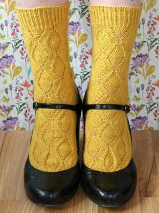 The socks are knitted from the toe up and use a gusset and heel flap construction, shaped with short rows. The socks have a pattern on the instep and around the leg, while the sole is knitted in stocking stitch. The gusset length is affected by your row/round gauge, so a small amount of optional maths is included to achieve the perfect fit.