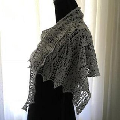 Lovely, all over lace shawlette with heavy beading has excellent weight and drape. The shape, accomplished with easy short rows, is a slightly asymmetrical long triangle, an easy to wear style. It’s feminine and flirty and sophisticated.