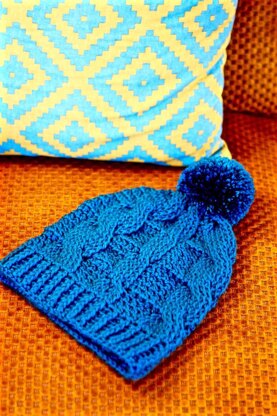 This hat features alternating large and small cables, and if you like, looks great topped with a pompom! As written, it will fit teenager - standard women’s size, and it comes with instructions to make it smaller, larger, or fitted instead of slouchy.