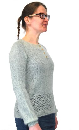 Designed with decorative median increases at the raglan lines, the sweater allows you to choose between long bishop sleeves that gather softly at the cuff or breezy short sleeves for a lighter option. A delicate lace motif reminiscent of shooting stars graces the hem. The timeless henley neckline and button plackets are done in twisted ribbing and include mitered increases for crisp corners.