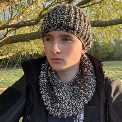 Designed for a teenage boy who loves scrambling and wears this under his helmet. The Mac hat and William scarf set are knitted in Fisherman’s Rib using two strands of yarn at the same time and worked in the round; it is named after a seriously precocious alpaca, MacWilliam.