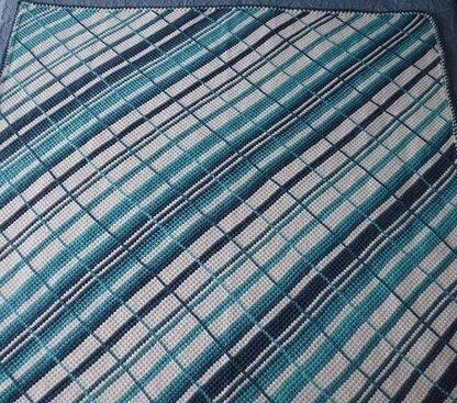 This pattern is an exceptionally easy way to mimic a plaid effect. It is crocheted using Tunisian C2C (corner to corner) crochet, resulting in diagonal stitch bands of colour. The “plaid” is completed using surface slip stitch worked in the grid created by Tunisian Simple Stitches. This pattern is suitable for competent beginners who understand the basics of Tunisian crochet. The pattern includes options for using self-striping or ombre yarns and a contrast colour, or 2 solid colours with a contrast yarn. There are infinite possibilities for colour choices, striping patterns and sizes.