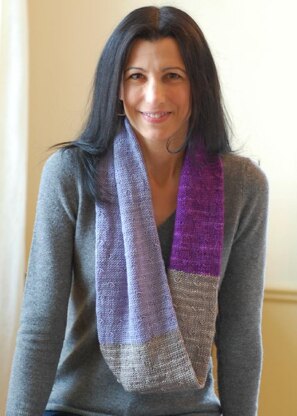 A part of the Dash It All! series, the Mad Dash Cowl is worked in the round with a cozy fingering weight yarn in a dashed, diagonal scallop stitch pattern. Made with three colorways, Mad Dash’s double-thick fabric worked at a loosened gauge results in a soft cowl that is warm and cozy without being too warm to wear indoors.