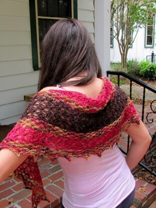 This shawlette is also perfect for all those odds and ends of sockweight or sport-weight yarns you have lying around. The sample shawl used the 82-yard mini skeins: 2 of Oregon Cellar, 1 of Ruby Spinel, and 1 of Bruin.