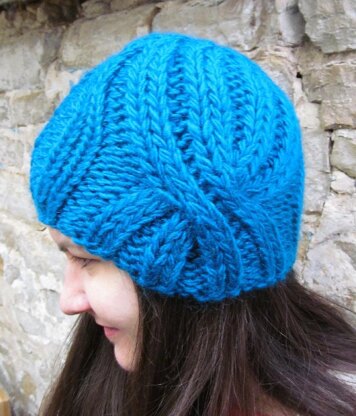 Mag Mile’s style derives from the single mega cable that adorns one side. The cable is simpler than it looks because all the stitch work is done in one round. The crossing double ribs create a stylish swoop down over one ear while the sides without the cable are worked in stretchy 2x2 ribbing. Knit bottom-up and in-the-round, this is a project that can be finished in an evening.