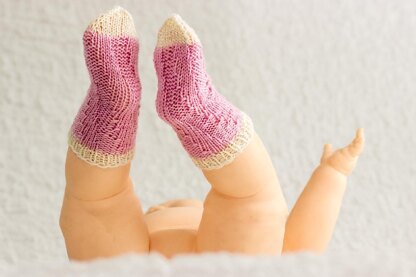 The magic thing about these socks is the fact that they are very easy to knit as they do not require you to turn a heel. The pattern forms a spiral and will fit on baby's foot no matter how you slip them on. No more fiddling to get the heel to be in the right place. Just pop them on and bingo - a perfect fit!