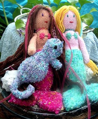 Maile the Mermaid, her friends Leilani the Mermaid and Sugar the Seahorse are all knit completely in the round and then felted in your washing machine! Two strands of wool, along with one strand of a novelty yarn like Crystal Palace Little Flowers are held together when knitting on US size 10 1/2 double-pointed needles for the mermaids. One strand of wool yarn and one strand of Little Flowers is held together when knitting the Seahorse on US size 8 double-pointed needles. Changing the skin-tone, the fin color and the hair allows you to make your mermaids and your seahorses uniquely yours! There are so many wonderful color combinations! Sugar the Seahorse requires one skein of 100% wool yarn (such as Ella Rae Classic) and one ball of novelty yarn. One strand of each is used throughout on US size 8 double-pointed needles. I highly recommend the use of Ella Rae Classic wool because it felts so beautifully, but as you need less than a skein of yarn to complete the seahorse, you may fin