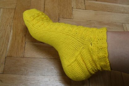 Arguably the most prestigious accomplishment for any professional cyclist is to wear the Maillot Jaune, the leader’s jersey of the Tour de France. Wearing the Yellow Jersey has inspired incredible feats of athletic prowess in attempts to keep it, protect it for the team, and get it back from an opponent. These socks include a flowery sunflower pattern, reminiscent of the fields of sunflowers often seen during the Tour, and a twisted stitch ribbed cuff. Including the Texas ornamentation on the heel flap is, of course, optional! Worked from the toe up, in sizes from XS (women’s 5-6) to XL (women’s 11+, men’s 10), these anklet socks use less then 200 yds of fingering weight yarn. Sample shown was knit in Cascade Fixation. Stitch patterns are presented in written and charted forms.
