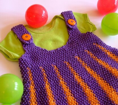 It is designed to be knit flat, in two pieces. The dress is made entirely in moss stitch. This tiny dress can be made in four sizes. If you use the same contrasting yarn for each triangle, you can carry the yarn across the dress. If you use different colours, you will have to cut the yarn each time and weave the ends in.