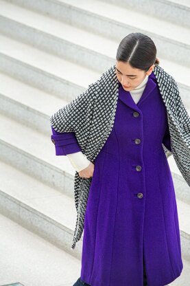 The shawl has an asymmetrical triangular shape and it is knitted from one corner to the opposite edge. The stitch pattern is made of slipped stitches on stockinette stitch using two bases in different colors. One color and base is worked at a time. The edges are worked in garter stitch and slipped stitches to create a sleek finish. Increases are worked at the right edge every right side row to create the shape of the shawl. The shawl is finished using a Modified I-Cord Bind-Off to match slipped edge stitches.