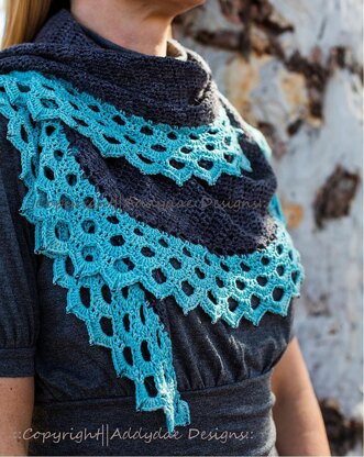 Majura is a shallow triangular shawl featuring a delicate lace edging dotted with beads for a little bling. Perfect for both striking contrasts or gentle complements of colour.