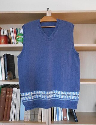Maktaba is a sleeveless sweater for men, with a V-neck. It is simple and classical, with just a colourwork motif at the bottom to make it interesting. It is knitted from the bottom up.