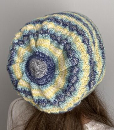 The hat can be worked on any needles used to work small circumferences in the round, but for the pleated decreases, an additional two double-pointed needles are required. A photo tutorial also is included for this special decrease.