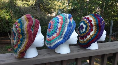This is a “slouchier” version of my Twilight Mandala Beret. I love to crochet mandalas and with that in mind, created and adapted a mandala to use for a beret pattern. A friend of mine told me she prefers her hats to be able to cover all of her hair. Hence, this “slouchy” version of my mandala beret. I love how it turned out in these great colors and I think you’ll really enjoy working the pattern for this wearable work of art! You’ll want to make at least one for yourself and several to give as gifts. It’s stretchy, so one size fits most women. Perfect for Christmas, Hanukkah, Birthdays, Mothers’ Day and many other occasions.