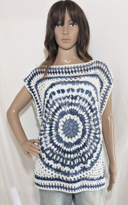 Quick to make mandala design tee in granny square crochet style. Size adjustments are easy, designed for sport weight or DK yarns.