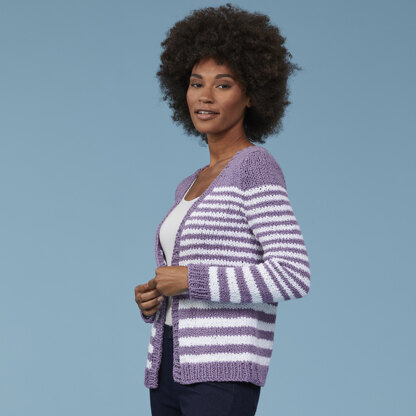 A classic striped women’s cardigan for all seasons layering. Use the two colors of HATTERAS shown or pick your favorite combination.