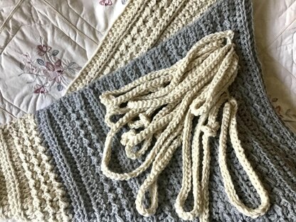 So unique in design and style is the March Child Boho Blanket. Cords motif added. Completely reversible, warm and comfy. Simple crochet stitches throughout.