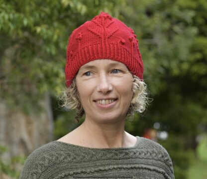 Worked in the round with either double pointed needles or a 40cm circular needle for working the body and double pointed needles for shaping the crown, the hat starts with a 1/1 rib where the knitted stitches are twisted for a neat finish. The leaves are created by travelling knit stitches and the bobbles are a non-turn kind, very easy and satisfyingly plump.