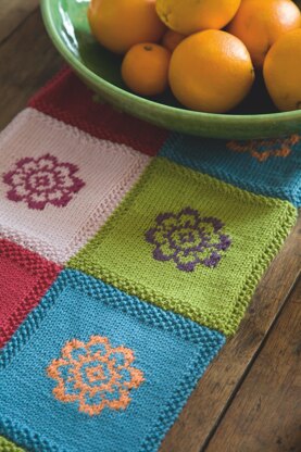 This patchwork runner is made from 20 squares in four different colourways, each edged with moss stitch borders. They are joined together to make a runner 2 squares wide by 10 squares long, alternative the four different designs in five blocks.