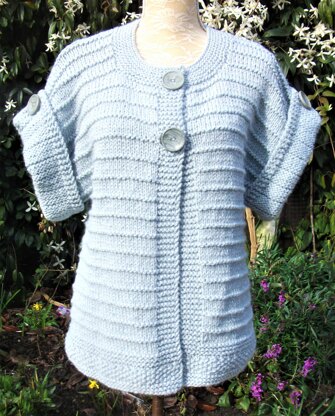 A modern gilet with lovely deep easy-fit short sleeves. The fold back cuffs are secured with a button. The stitches used are a mix of ridged stocking stitch, with the neat lower border in garter stitch and moss stitch.