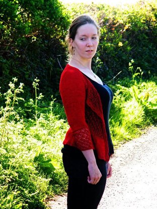 Marja is a unique cardigan featuring a seamless construction, flattering waist shaping, and true lace (worked on both RS and WS rows). Only the lace panels and cuffs are worked with one strand of yarn; the rest of the cardigan is worked with two strands held together.