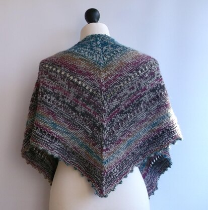 A shawl for small shawl lovers. Two shades of yarn are held together to create a marled effect. Bands of stocking stitch and reverse stocking stitch with rows of eyelets to separate sections, make a reversible garment.