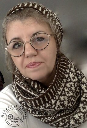 These are two patterns, one is for a cowl, one is for a hat. Both are worked in the round and using the Fair-Isle knitting technique. Make sure there this enough contrast between your two shades! Take a black and white photo of them to see if their colour value is different enough for the pattern to show clearly. This infinity-mobius shawl is very interesting! There is a twist when you knit it but when you put it to your neck twice, there is no twist anymore and always the right sides are up on both layers.