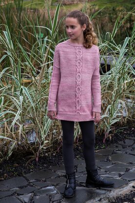 The tunic is worked top down. It begins with creating a round neckline in the front. At the same time yoke and sleeves are worked by increasing stitches with different pace. When the yoke is formed, sleeves are separated from the body which continues to be knitted in round till the hem. Then front and back are worked separately till the end. Sleeves and neckline are worked in round by picking up stitches from the edges. No seaming required.