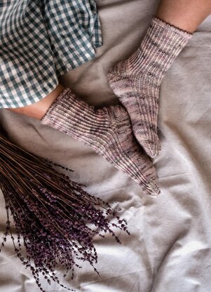 They have a super-soft feel and will look particularly pretty if worked with a speckled or multicolored fingering-weight yarn. You can use a thread of gold glitter at the picot and toe to give the socks a bit of glamour.