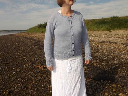 This is a cardigan knitted from the bottom edge and up with a lace edging at the bottom edges. The pattern is made for at yarn with a gauge of 18 stitches per 10 centimeters.