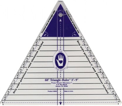 Equilateral Triangle Ruler for cutting 3- to 9-inch triangles, measured on a finished side. Measuring with our multiple-size 60-degree rulers is easy! They work perfectly with our hexagon family of templates (Sets G, H and N). Other equilateral triangle rulers measure the height of the triangle from the center of the bottom to the top point. Our rulers measure the triangle on the side. In fact, all From Marti Michell 60-degree family members are size-defined by the length of the finished side because it's the only measurement that is common to all of the shapes in the family.