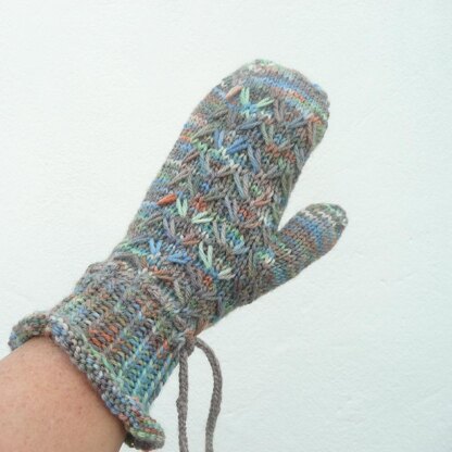 An easy pattern to knit mittens which fit really well, due to the ties around the wrist and the shape. The cuff is flared and comes up quite high to ensure the wearer stays warm, with no drafts between outerwear and arms, as is sometimes the case with shorter cuffs. You will need to be able to knit in the round and be used to slip stitch patterns. If these are new skills to you, it is a great small project to practise these skills.