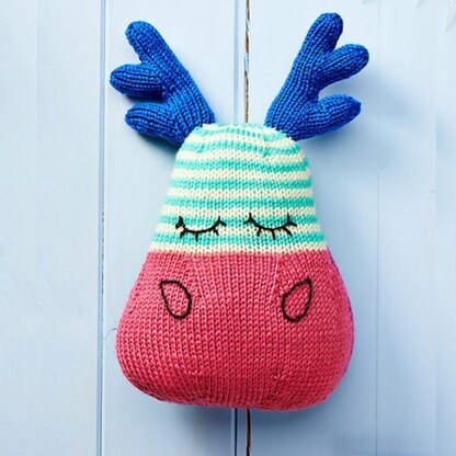 A bright and cheerful moose head to hang on your wall or cuddle on the sofa! Marvin is knitted in stockinette on straight needles in aran (worsted) weight yarns. You will also need a bag of toy filling to stuff the cushion, and some black yarn to embroider the features. Designed by Amanda Berry @fluffandfuzz, the moose head knitted in acrylic aran yarns on single pointed needles (not in the round). For confident beginners and above, other techniques used include casting on and off, knits, purls, increases and decreases, knitting stripes and seaming to finish.