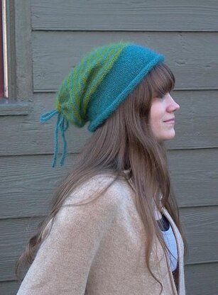 Mary Jane may be sheer, but she is warm! Kid silk haze makes a wonderfully soft slouchy beanie. The yarn’s natural halo allows the tonal stripe colors to just melt together.