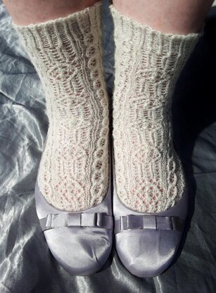 This is a toe-up, beaded, lace and cable sock with a Fish Lips Kiss Heel (or your own preferred heel), and a recipe cuff.
