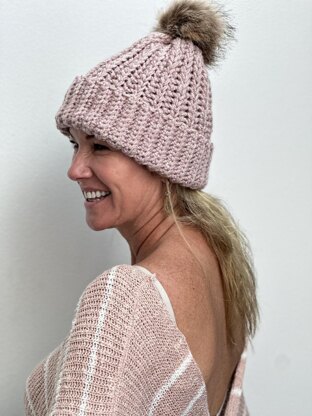 Stay cozy with this chunky beanie! Its flat construction makes it a simple and quick project. The slip stitch produces a lovely ribbing that mimics the knitted fisherman stitch, while the band is constructed with sc in the back loop only. Complete the look with a pompom.