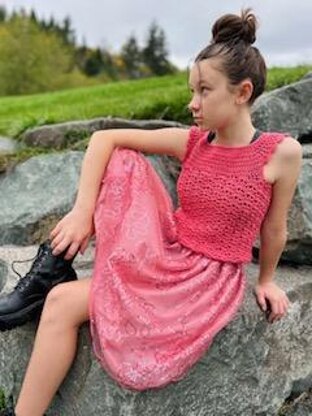 Mary’s Shell is perfect for pairing, with a tutu or jeans. Worked in a worsted weight yarn, in Snap Dragon Shells, with the option of finishing with pearls. Mary’s Shell is super cute!