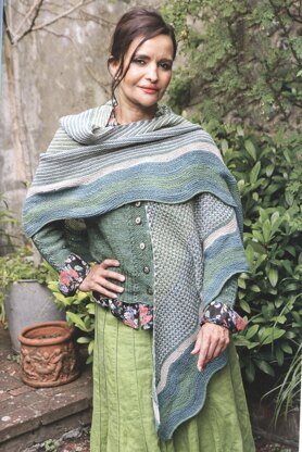 This is a shawl of two halves. One side is garter stitch stripes, the other, a rib pattern. A zig zag line runs between them, down the center. Finishing with a wavy border.