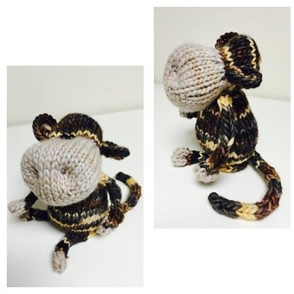 Maude is knit in the round using double pointed needles. Her arms and legs are made using I-cords. The patters is written for a small-ish Monkey (about 5" tall seated), but she can be 'up-sized' using bulky yarn and US8 double pointed needles.