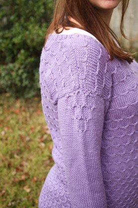 Maurepas starts with a front and back, knitted bottom up separately, then seamed. The back is slightly longer than the front with a split hem. Cables start small at the bottom of each piece, then get progressively bigger going up to the shoulders. Stitches are picked up around the armholes for top-down sleeves worked in the round. A small cable panel dresses up the shoulders. There are two options for the neckline: an off-the-shoulder 80s-esque version, or a narrower version that won’t fall off your shoulder.