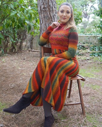 Maxi dress with skirt in mermaid shape, feminine and tight fit. The upper body has a beautiful colorwork and gorgeous lace edgings at neck and sleeves. The colorful yarn produces the beautiful vertical and horizontal stripes. The dress is worked with two fingering yarns and is very light but warm too. The skirt is worked sideways and is shaped with short rows. You can shorten the skirt or change the fit by adjusting the no. of sts and the position of the short rows. The dress is worked with two yarns, 1 strand of colorful yarn A and 1 strand of yarn B (MC1). It will be helpful before starting you knitting, to prepare balls winding the two yarns together, changing the colors of B yarn every time the shade on the colorful yarn A is changed.