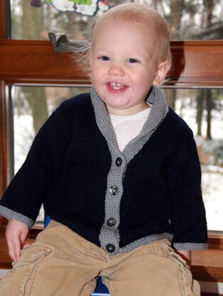 Max’s Knitted sweater was designed for my Grandnephew. One early autumn afternoon I received a phone call from my Niece Adrian; Max’s mommy. Adrian asked me to design a blue cardigan sweater with grey trim for Max. He has a sweater with those two design features but it is a pullover. The pullover is Max’s “Sunday Best” sweater, but it’s a struggle to get him into it. Every Sunday it’s the same story… it starts off quiet and calm but when it’s all said and done Max ends up frustrated and in tears. He really does not like having the pullover pulled over his head. What was a calm and quiet morning is “not so calm and quiet” any longer. Adrian loves Max in his pullover but doesn’t want to make him wear something that just brings on frustration.