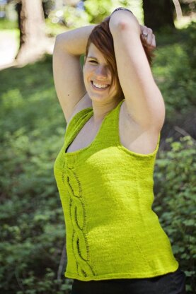 May is the month when the days start to really warm up for much of the US and Europe—the month when dancers of all types come out of their winter stupor and take to the streets and fields to celebrate the return of spring and life. This tank top is knit in the lovely fingering-weight Baah La Jolla yarn, making it light and airy for the hottest weather. The central cable stitch uses dropped stitches to further play with the idea of airy solidity.