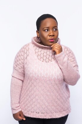 Mbalenhle is knit with two strands of kid silk yarn held together. The pullover has a lace body pattern with delicate leaves and stockinette sleeves for an elegant finish. The pullover is knit from the top down with a turtleneck and drop sleeves.