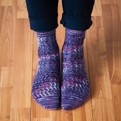 Meandering is worked from the cuff down.  The Meandering stitch pattern is featured on the front of the leg and top of the foot.  This pattern features a short row heel and wedge toe.